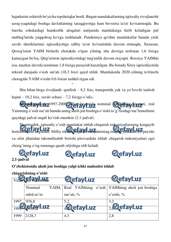 qismi bo'lib, o'zifodasini real YalM hajmining oshishi hamda aholi jon boshiga nisbatan