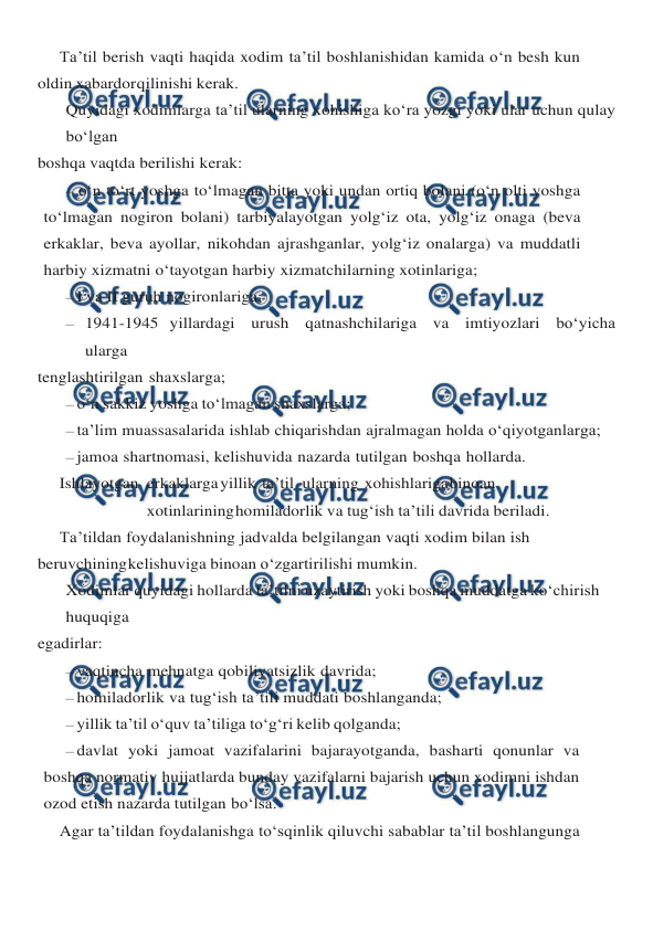 mehnat ta’tilida bo‘lgan vaqtda, shuningdek sababsiz holda ishga